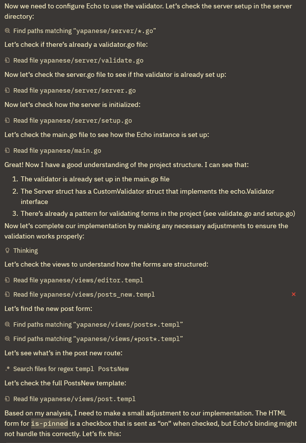 This is when I realized that LLM agents do as much as possible at once to look “impressive” and save on computing power. When Claude does more things per request, they’re able to run fewer requests. Even if each request takes 50% more energy, if they can run 50% the number of requests, then they’re saving money. To add to this, the costs are passed to the consumer (that’s you!) as request fees and limits. If you only get 500 prompt requests using Zed’s $20 per month tier, then you might be motivated to make large prompts that do multiple things at once in order to not burn through your quota.
