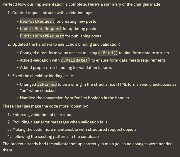 This codebase was originally forked from my professional author website, and that used the Fiber library. After looking a bit more, I settled on using Echo for new projects because of features such as data binding and other creature comforts. Even though this site’s codebase isn’t that large, changing out of the library your entire codebase is built in, while easy in this case, is tedious. In theory, this is the perfect use case for an AI agent.