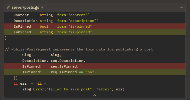 Oh boy, this was a mixed bag. While not perfect, most of the changes it made were a “good enough” starting point. Once I learned you need to tell it “Run go vet ./... to test your changes”3 to get it to stop writing code that won’t compile, it was even an “oh, that worked” experience. I’m not sure if I’m ashamed to say it or not, but the changes Claude made (with heavy edits) are actually running on this website.